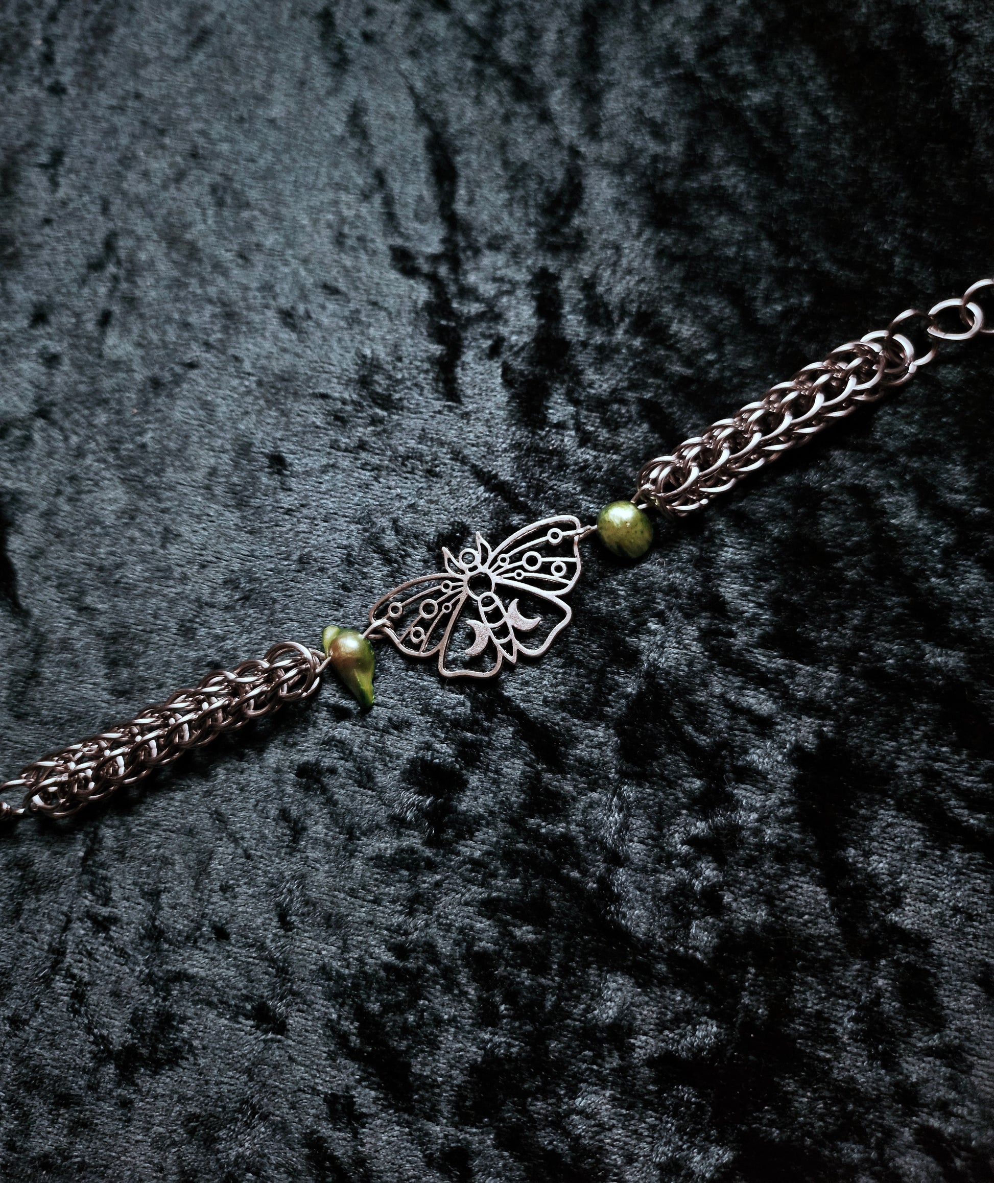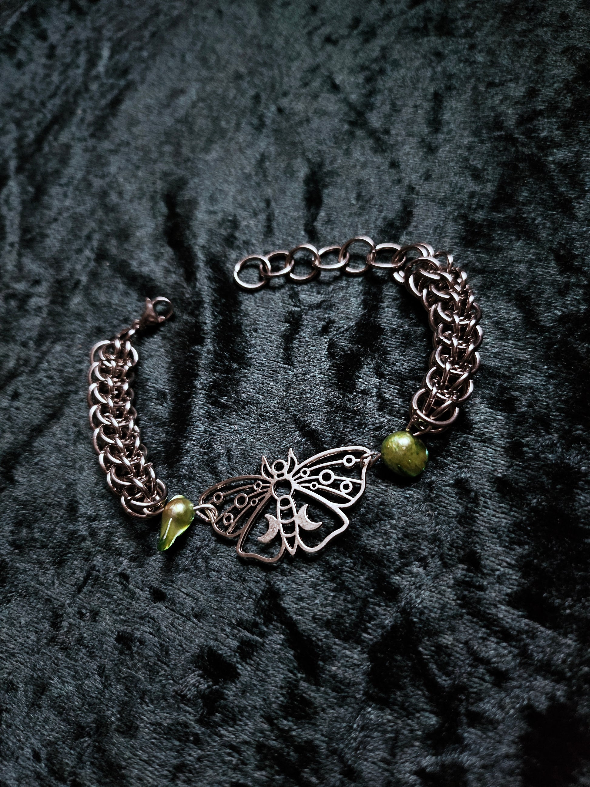Chainmail mail bracelet with moth pendant and dyed fresh water pearls