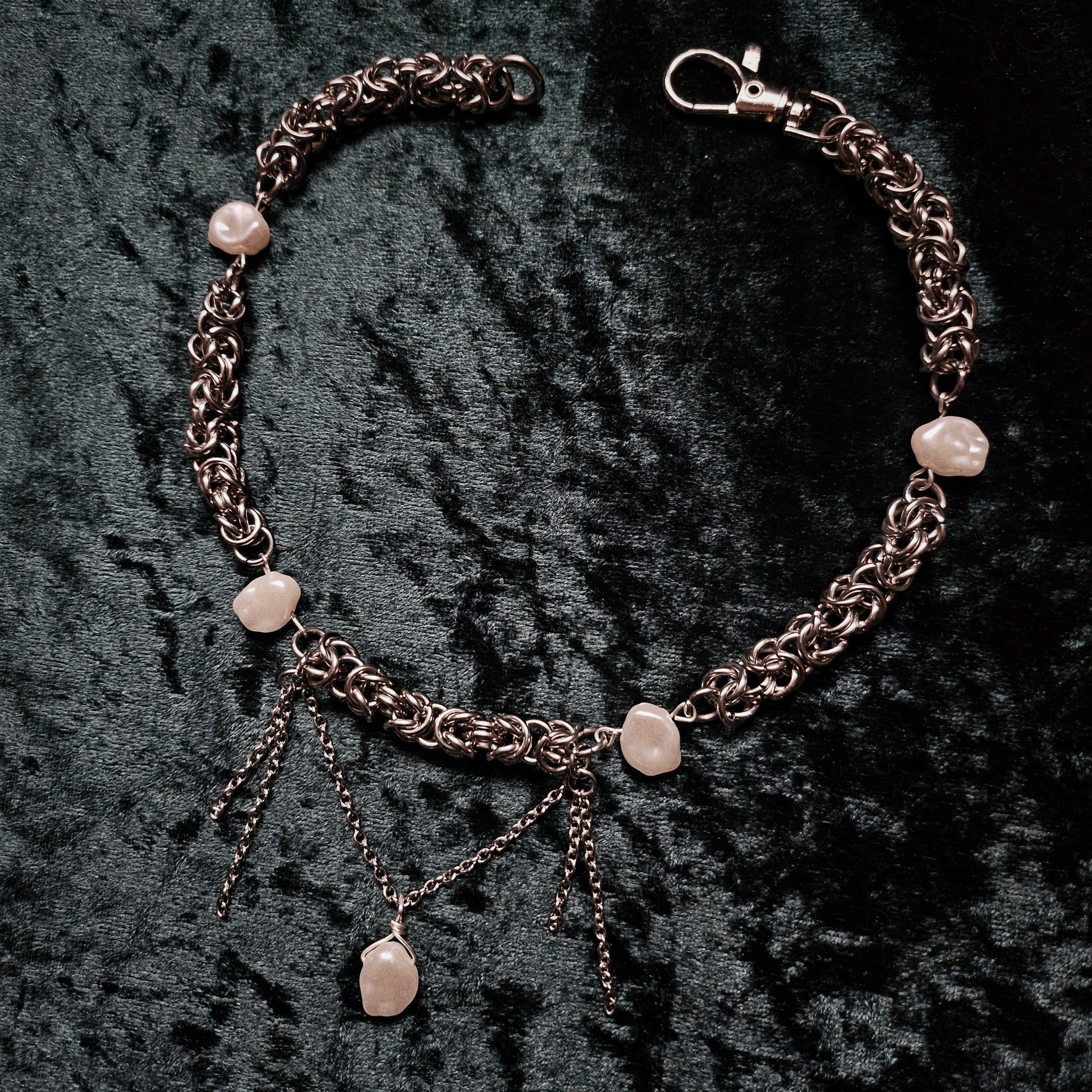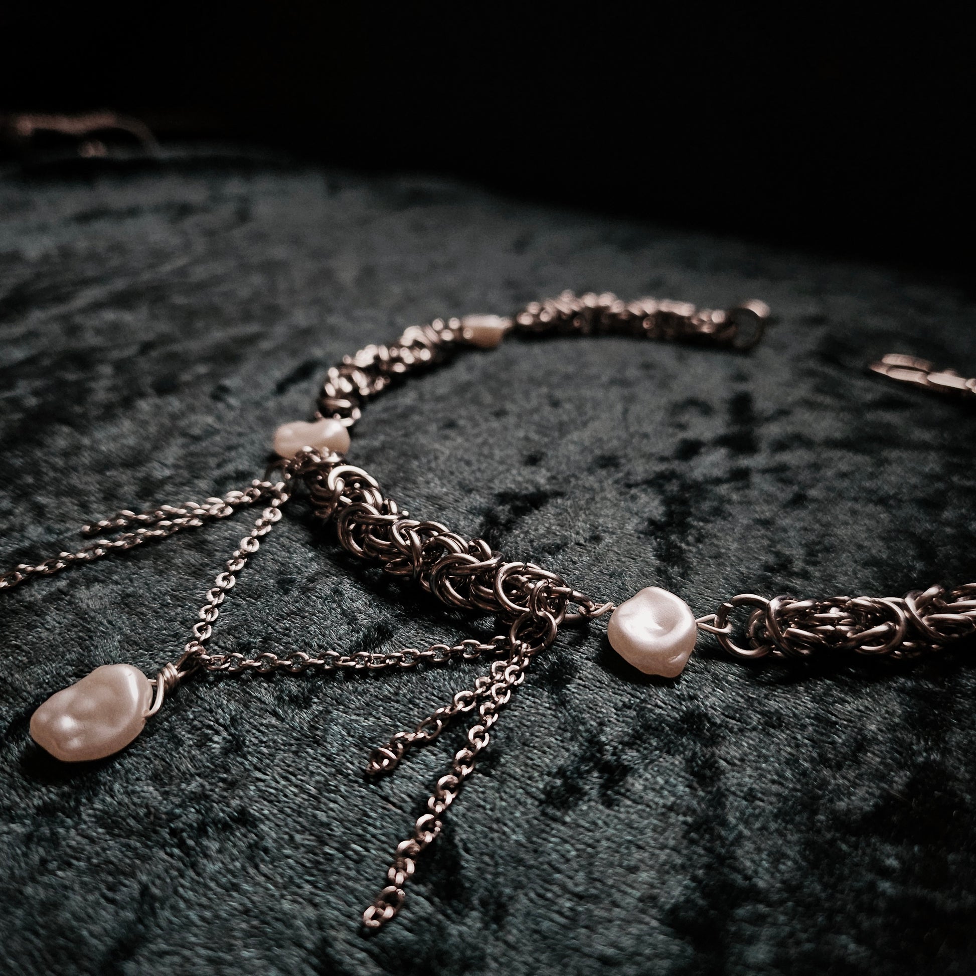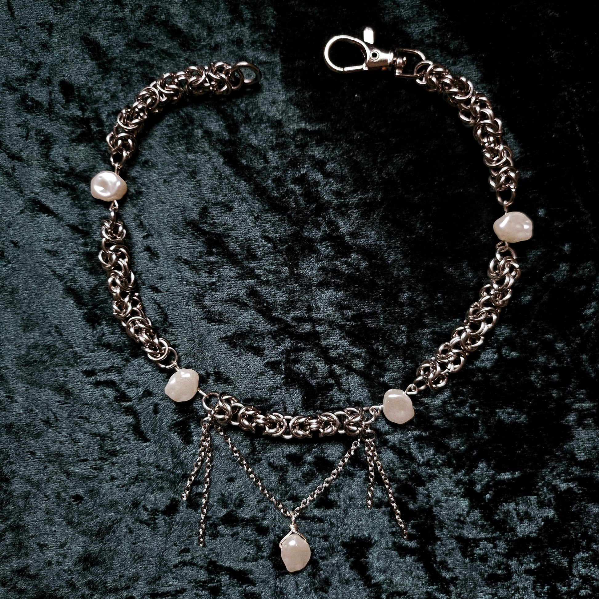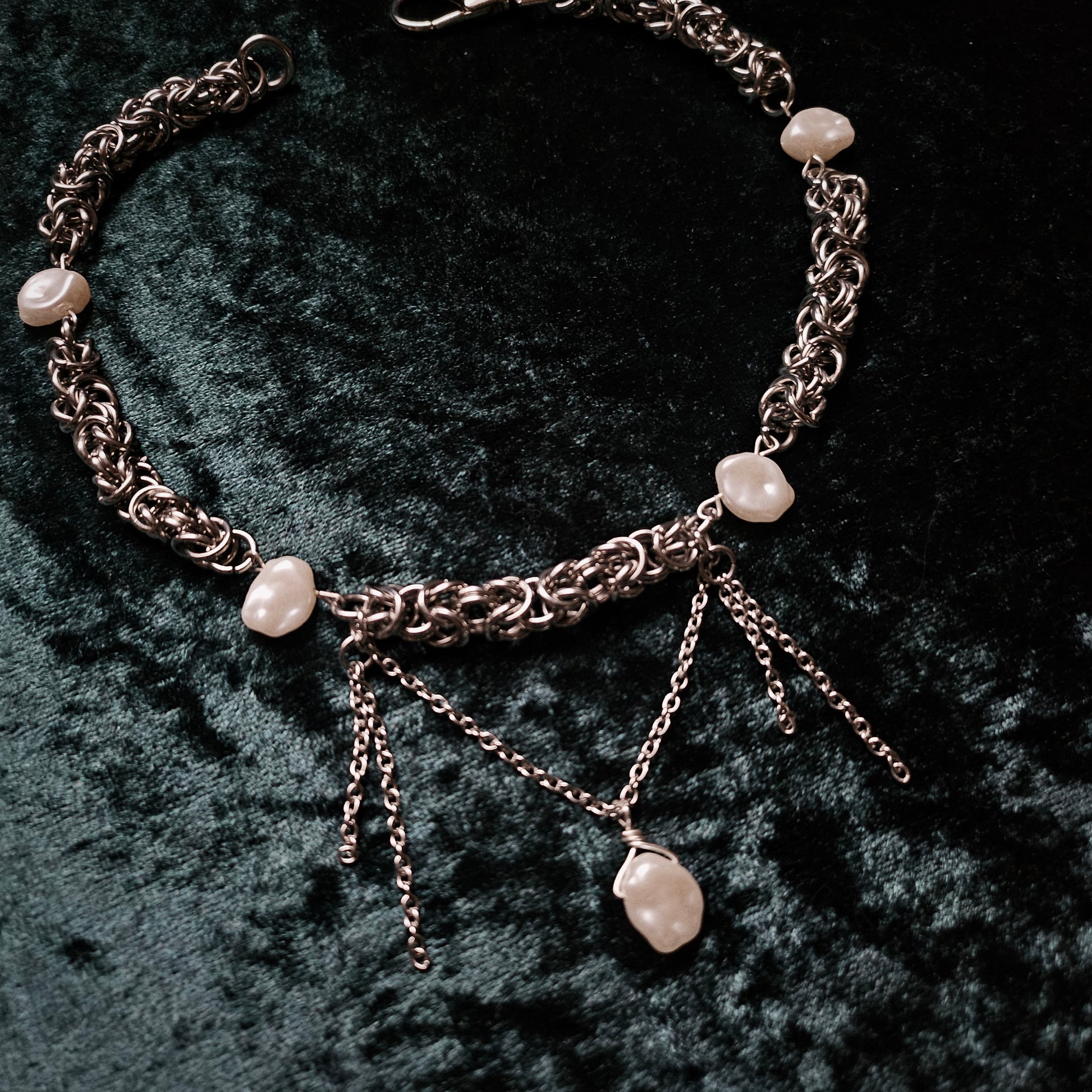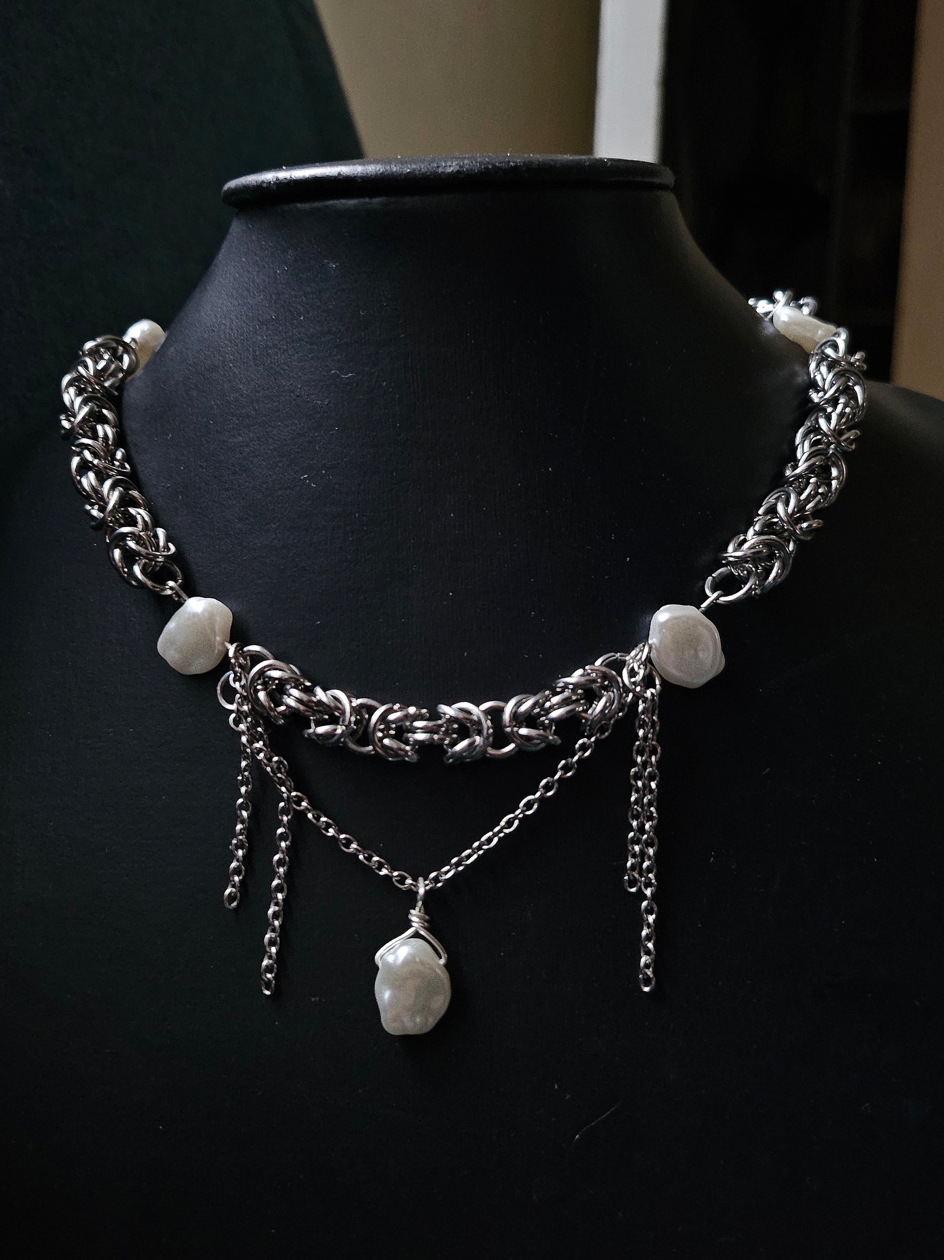 Stainless steel chainmail necklace with faux white pearl beads, adjustable.