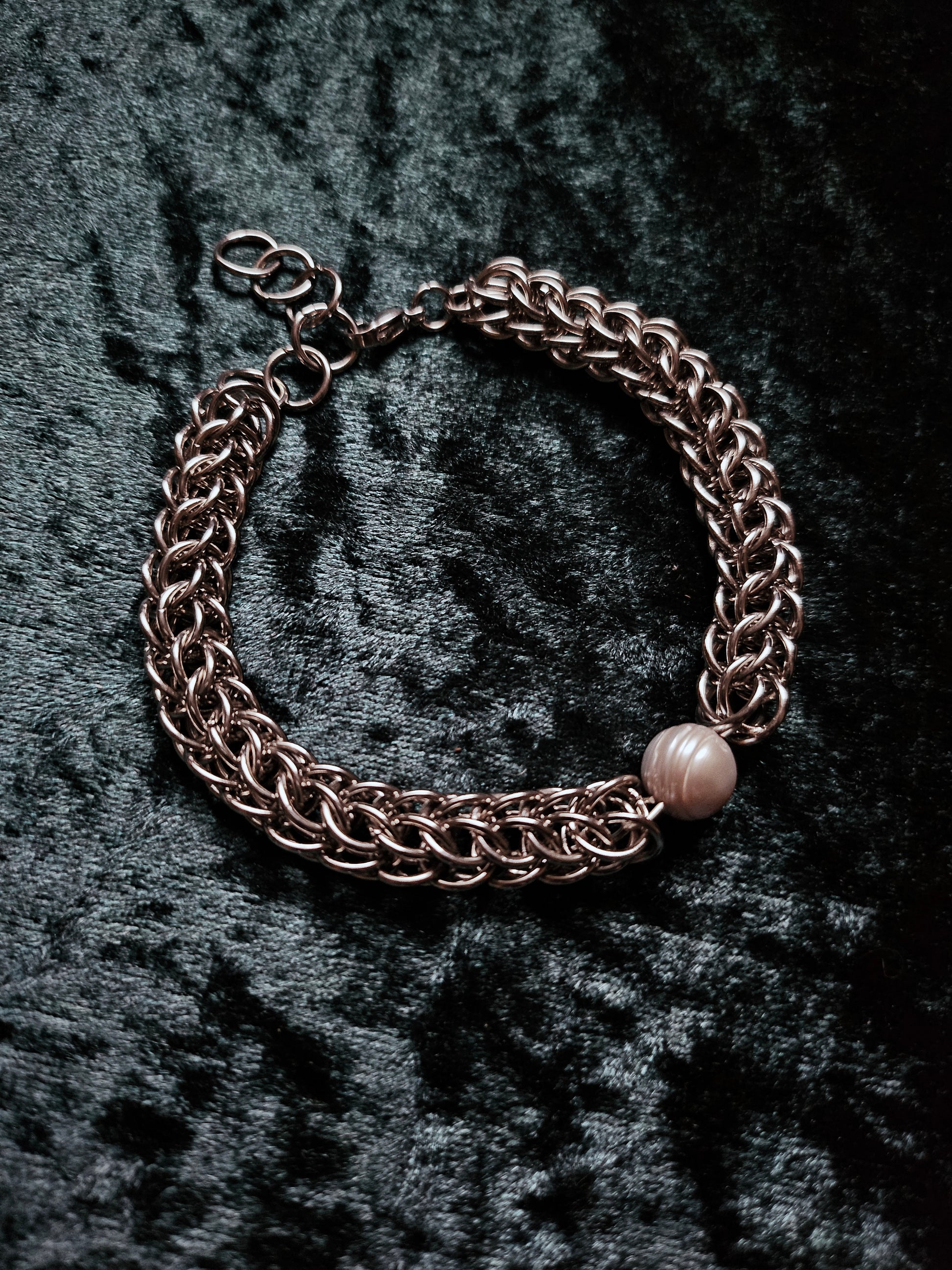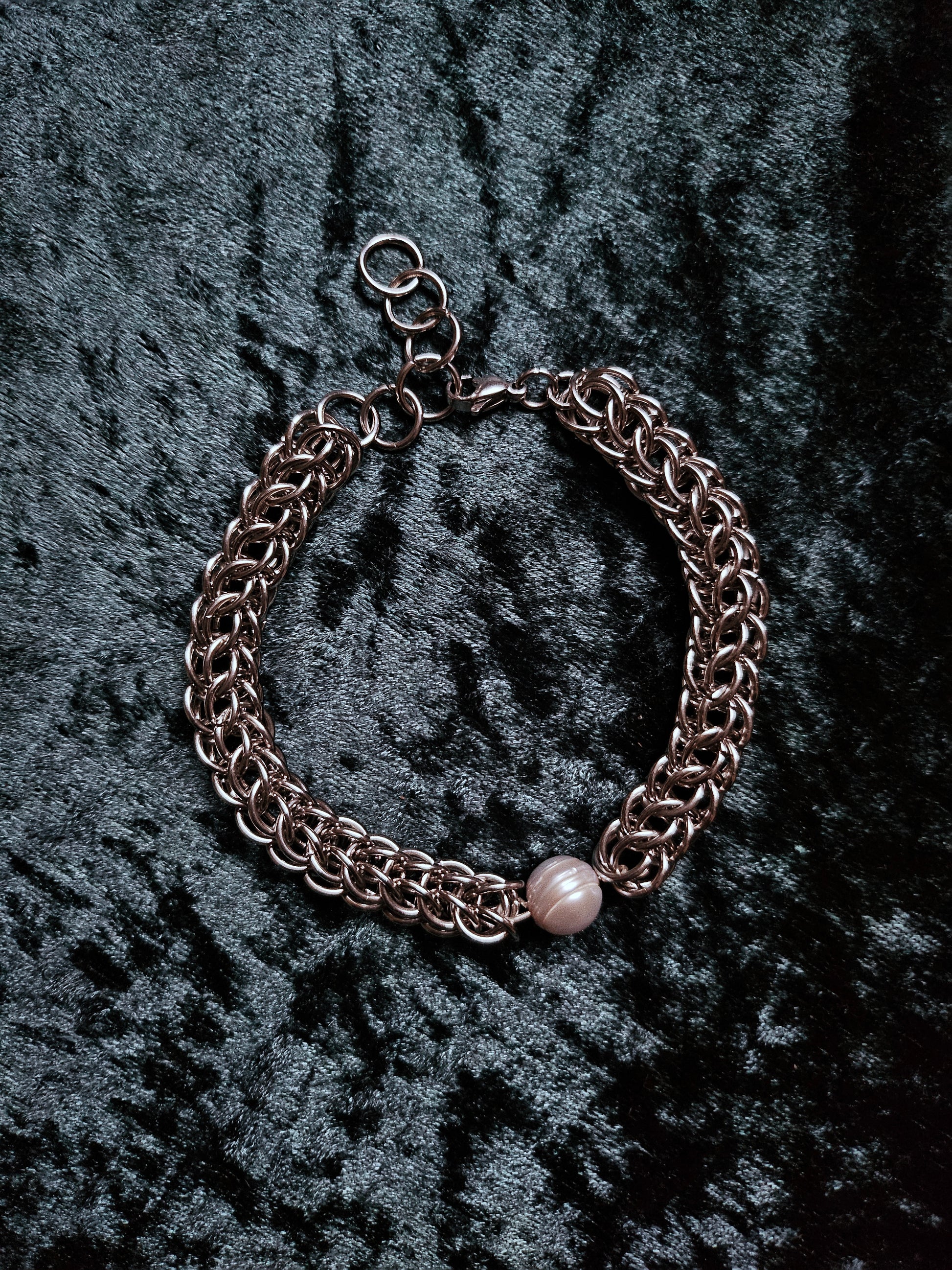 Chainmail stainless steel bracelet with real freshwater pearl, adjustable